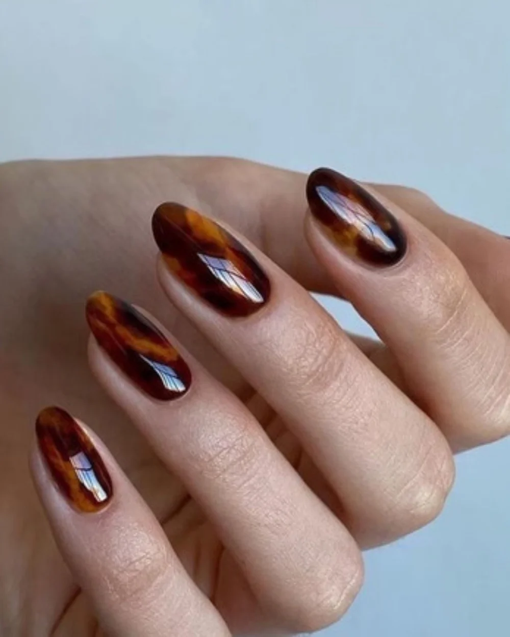 Okay, this one is trendy but still totally wearable. Tortoise nails are like the cool-girl glasses of the manicure world. They feel designer-inspired without the price tag. I love how the mix of amber and brown looks with fall tones. You could wear this with black, beige, or even deep green.