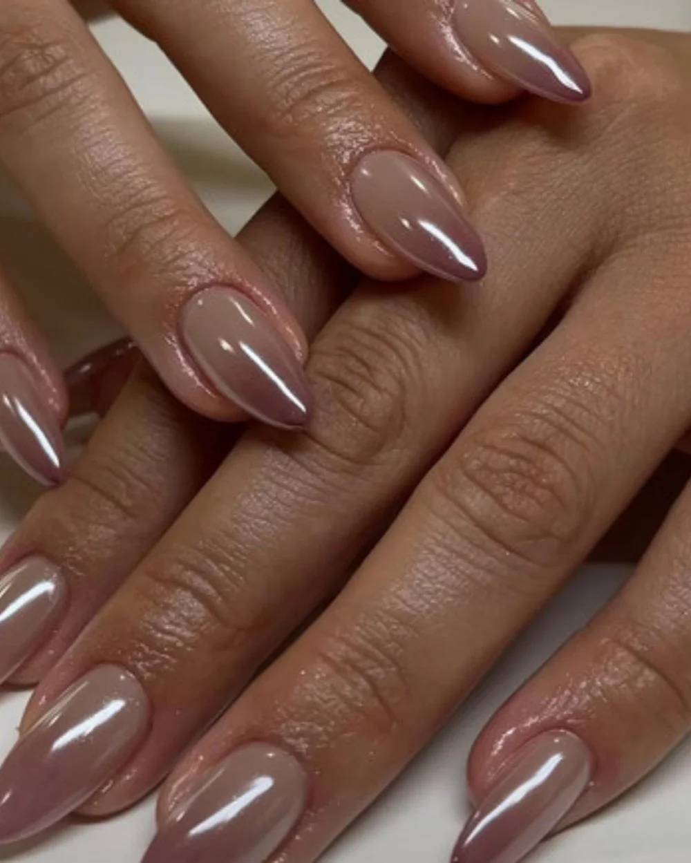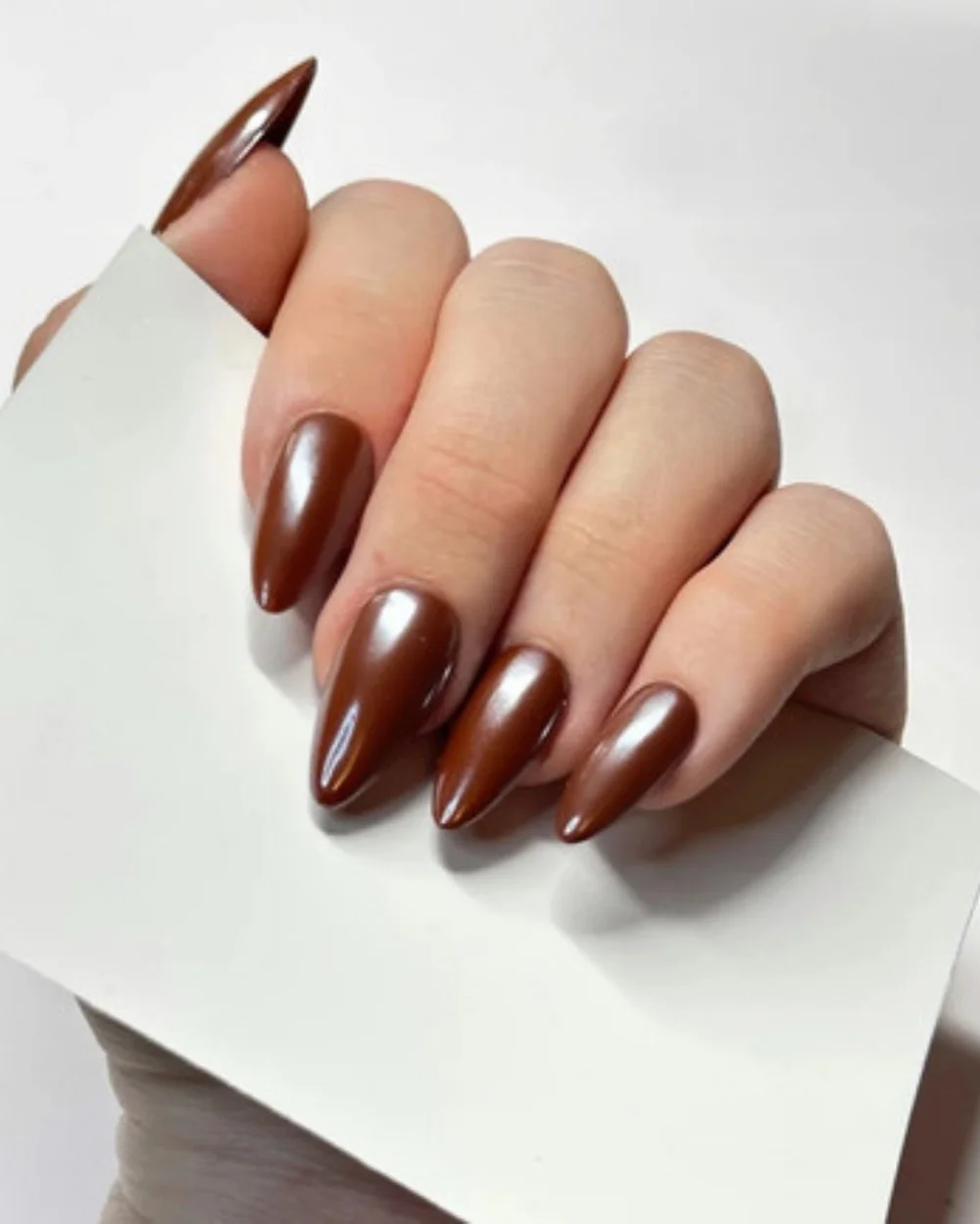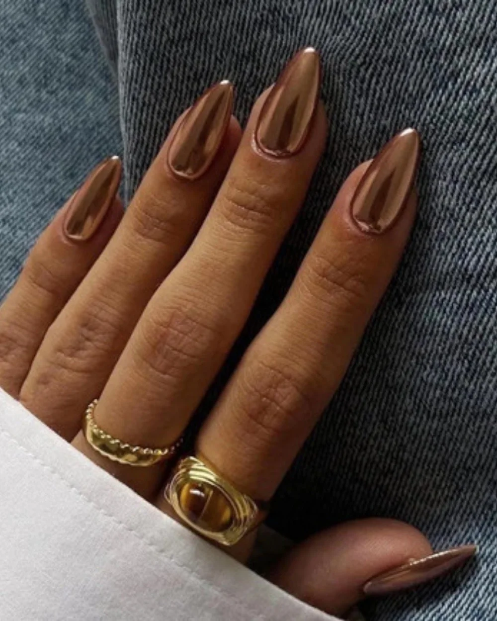 These are glossy, glam, and straight-up cool. The coffee brown chrome gives mirror-like shine that looks amazing in pics. If you want something different from the typical matte or cream finishes, this is your moment. It’s giving fashion week energy in the best way.