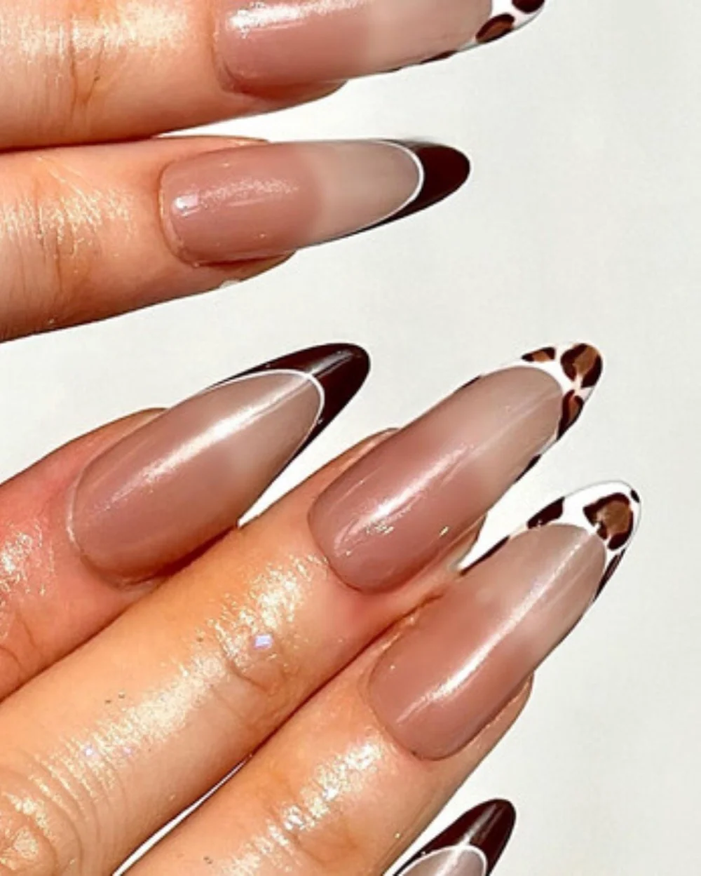 This is such a pretty twist on the classic French. Instead of white, you get that tortoise pattern right at the tips. It’s the perfect way to try a print without going full pattern. These would be cute for work, events, or just making your latte look better on Instagram.