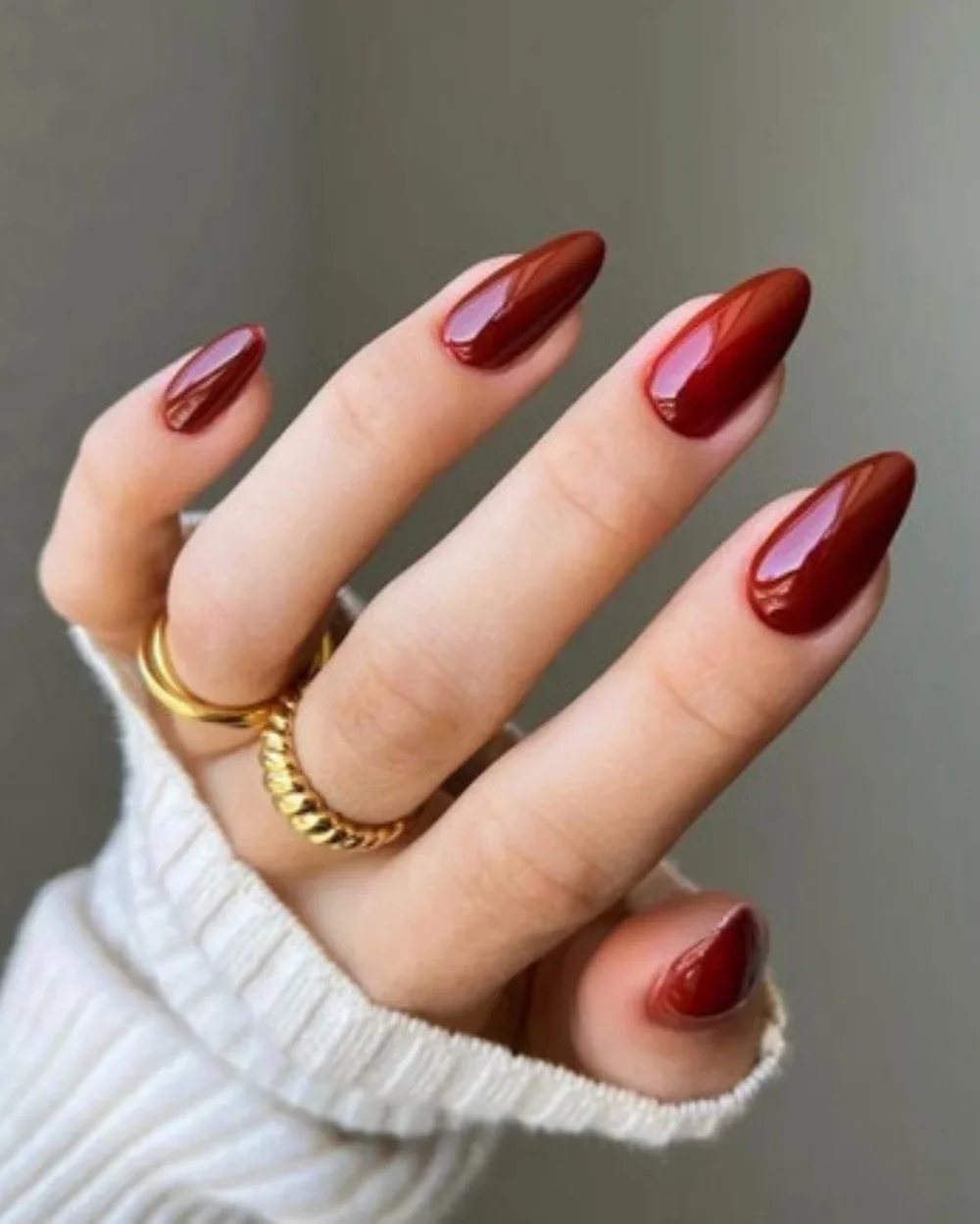 If you’re more of a full-color kind of girl, burgundy is calling your name. It’s rich, glossy, and screams fall in the best way. This color gives dark romance vibes without going full goth. Plus, it looks amazing with gold rings and chunky knits. You seriously can’t go wrong with this one.